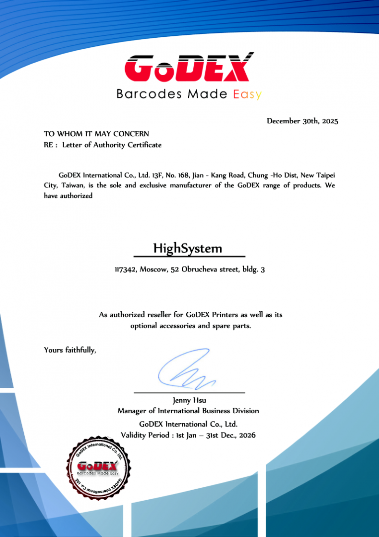 GoDEX International Co.,Ltd (GoDEX) — опытный игрок в индустрии штрих-кодирования и маркировки. Первый принтер этикеток компании был выпущен в 1993 году, и с тех пор бренд известен в качестве одного из передовых производителей в мире. GoDEX позиционирует себя как разработчик и производитель оборудования, способный сконструировать любую модель под нужды конкретного предприятия. Одним из важных преимуществ для потребителя является приемлемая цена и наличие технических характеристик, на уровне или превосходящих более дорогие аналоги.