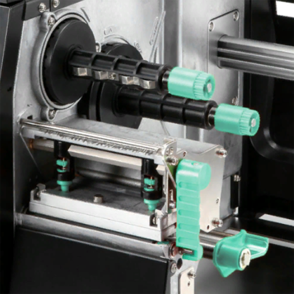 Конструкция печатающего механизма снабжена простыми регулировками линии печати, а также распределения давления на печатающую головку, что позволяет избежать перекосов красящей ленты при печати как узких, так и широких этикеток.