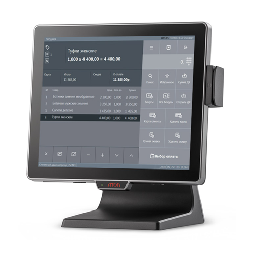 В нашей компании можно приобрести сенсорные POS моноблоки компании Атол или Posiflex. POS-оборудование русифицировано. Его можно доукомплектовать фискальным регистратором для выполнения требований ФЗ-54. В базовой комплектации предоставляется программное обеспечение и система бухгалтерского учета. Ее можно сменить при необходимости.