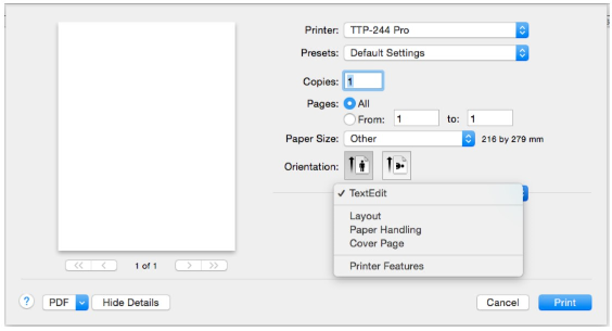 - Изменить параметр « TextEdit» на «Принтер» (Printer Features) в открывшемся меню.